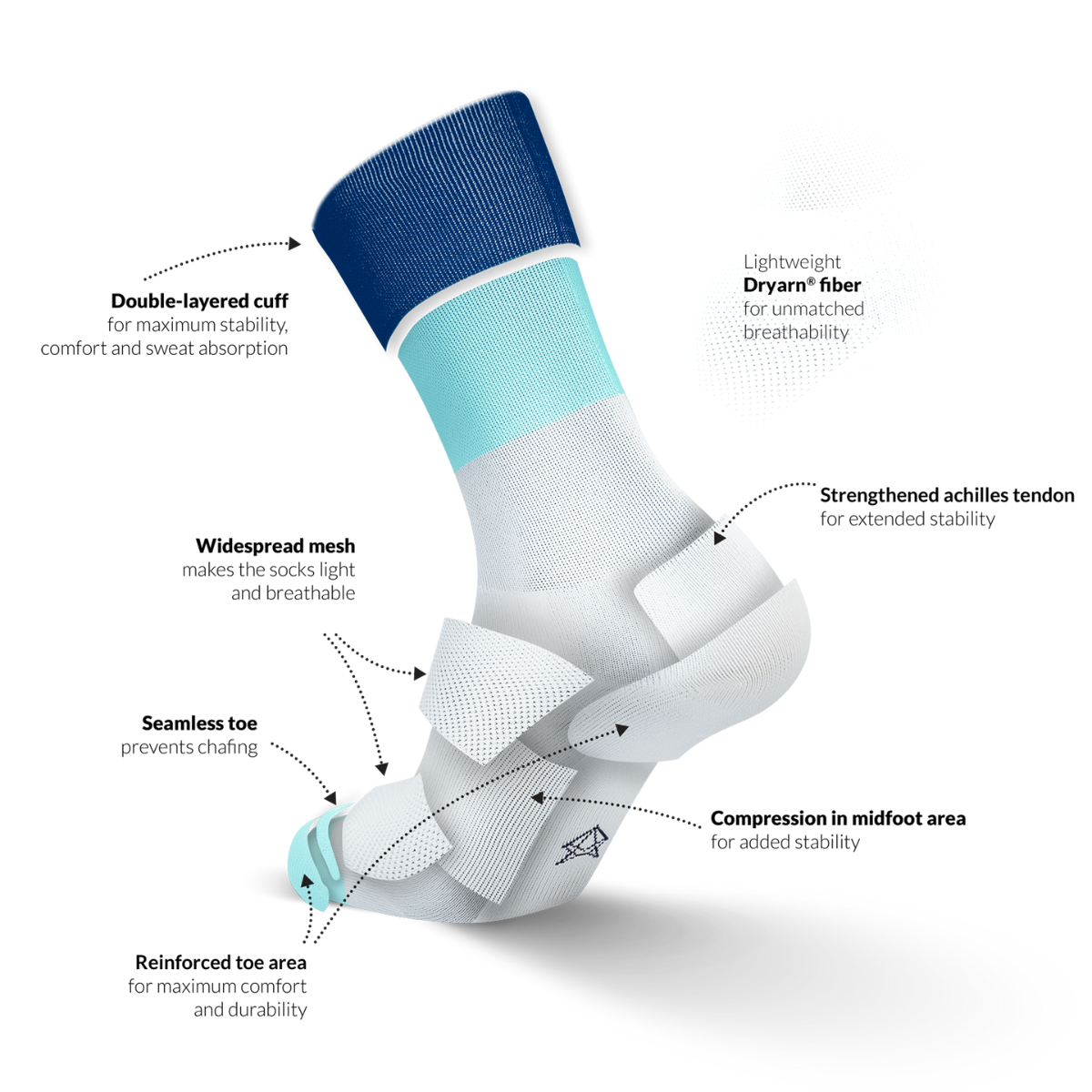 The ultra-light Dryarn®microfibre used in these high-cut performance socks offer unmatched breathability and are heat regulating, meaning they keep you cool and comfortable with maximum comfort for an outstanding performance.